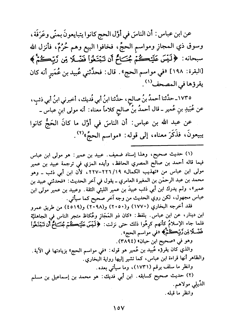 ١٧٣٥ - حدَّثنا أحمدُ بنُ صالح، حدَّثنا ابنُ أبي فُديك، أخبرني ابنُ أبي ذئبٍ، عن عُبَيدِ بنِ عُمير - قال أحمدُ بنُ صالحِ كلاماً معناه: أنه مولى ابنِ عباس - عن عبد الله بن عباس: أن الناسَ في أوَّل ما كانَ الحَجُّ كانوا يبيعونَ، فذَكَرَ معناه، إلى قوله: "مواسم الحجِّ" (¬٢).