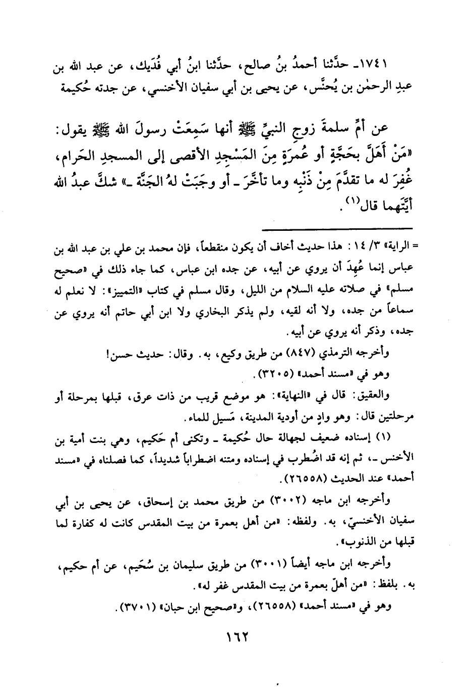 عن أمِّ سلمةَ زوجِ النبيَّ - صلَّى الله عليه وسلم - أنها سَمِعَتْ رسولَ الله - صلَّى الله عليه وسلم - يقول: "مَنْ أَهَل بحَجَّةٍ أو عُمرَةٍ مِنَ المَسجدِ الأقصى إلى المسجدِ الحَرام، غُفِرَ له ما تقدَمَ مِنْ ذَنْبِه وما تأخَّرَ - أَو وجَبَتْ لهُ الجَنة -" شكَّ عبدُ الله أيَّتَهما قال (¬١).