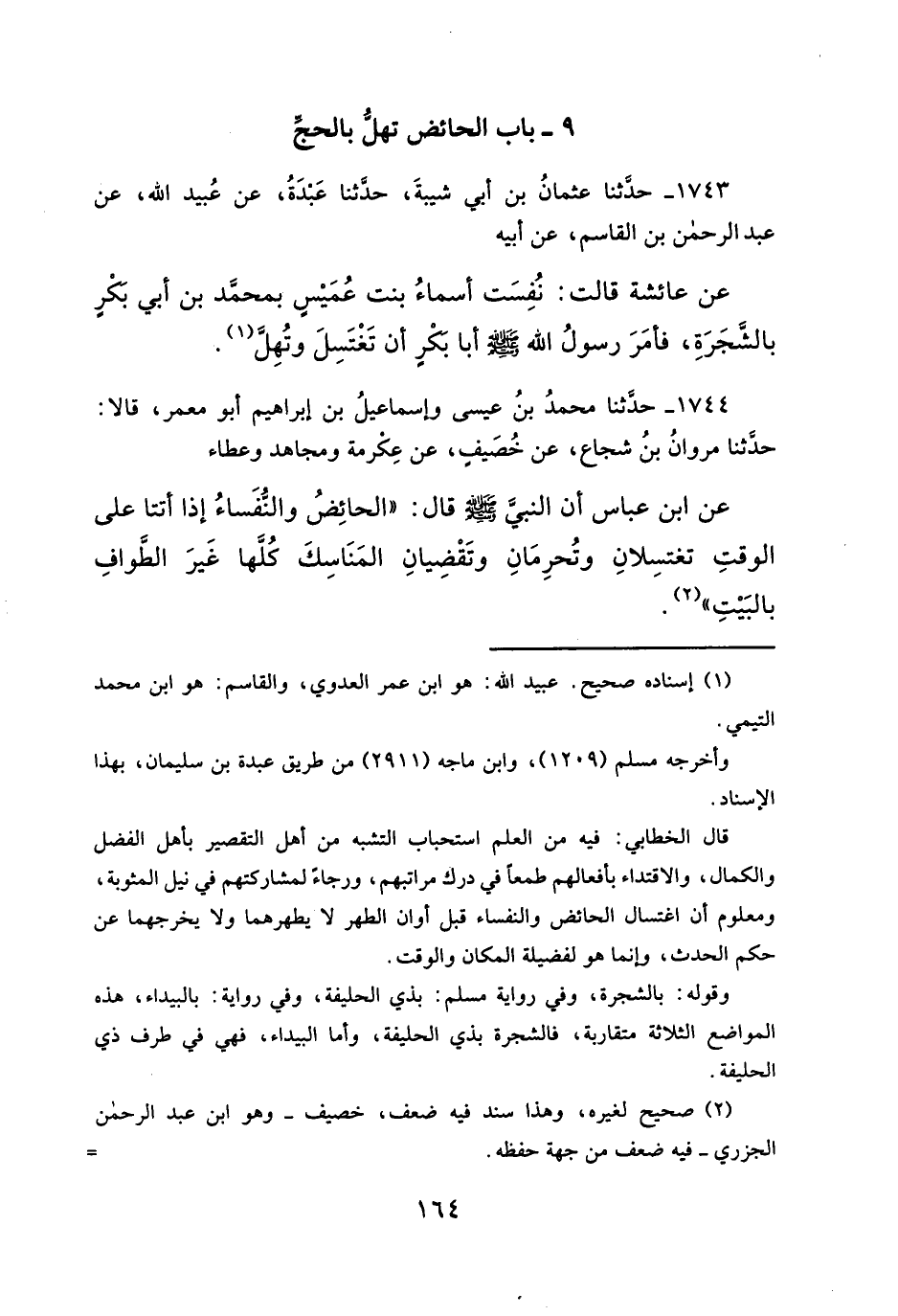 عن عائشة قالت: نُفِسَت أسماءُ بنت عُمَيْسٍ بمحمَّد بن أبي بكرٍ بالشَّجَرَةِ، فأمَرَ رسولُ الله - صلَّى الله عليه وسلم - أبا بكرٍ أن تَغْتَسِلَ وتُهِلَّ (¬١).