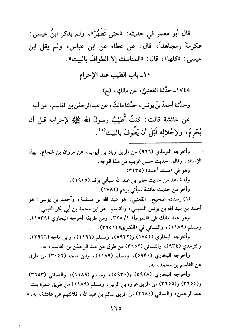 (¬١) إسناده صحيح. القعنبي: هو عبد الله بن مسلمة، وأحمد بن يونس: هو أحمد بن عبد الله بن يونس التميمي، والقاسم: هو ابن محمد بن أبي بكر التيمي.