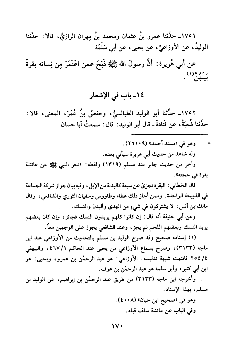 عن أبي هُريرة: أنَّ رسولَ الله - صلَّى الله عليه وسلم - ذَبَحَ عمن اعْتَمَرَ مِن نِسائه بقرةً بَينَهُنَّ (¬١).