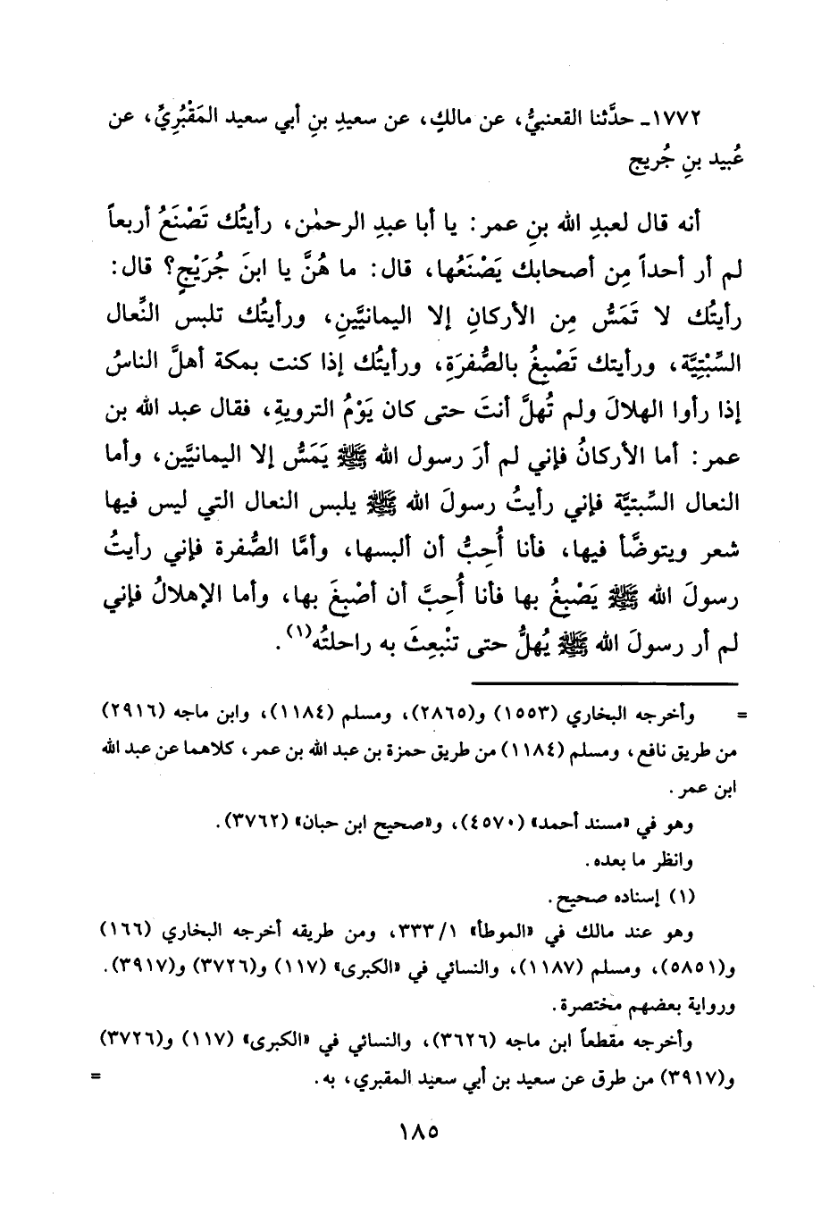 أنه قال لعبدِ الله بنِ عمر: يا أبا عبدِ الرحمن، رأيتُك تَضنَعُ أربعاً لم أر أحداً مِن أصحابك يَصْنَعُها، قال: ما هُن يا ابنَ جُرَيجٍ؟ قال: رأيتُك لا تَمَسُّ مِن الأركانِ إلا اليمانيَّينِ، ورأيتُك تلبس النعال السبْتِتَّة، ورأيتك تَصْبغُ بالصُّفرَةِ، ورأيتُك إذا كنت بمكة أهلَّ الناسُ إذا رأوا الهلالَ ولم تُهلَّ أنتَ حتى كان يَوْمُ الترويةِ، فقال عبد الله بن عمر: أما الأركانُ فإني لم أرَ رسول الله - صلَّى الله عليه وسلم - يَمَسُّ إلا اليمانيين، وأما النعال السِّبتيَّة فإني رأيتُ رسولَ الله - صلَّى الله عليه وسلم - يلبس النعال التي ليس فيها شعر ويتوضَّأ فيها، فأنا أُحِبُّ أن ألبسها، وأمَّا الصُفرة فإني رأيتُ رسولَ الله - صلَّى الله عليه وسلم - يَصبغُ بها فأنا أُحِبَّ أن أصْبغَ بها، وأما الإهلالُ فإني لم أر رسولَ الله - صلَّى الله عليه وسلم - يُهلُّ حتى تنْبعِثَ به راحلتُه (¬١).