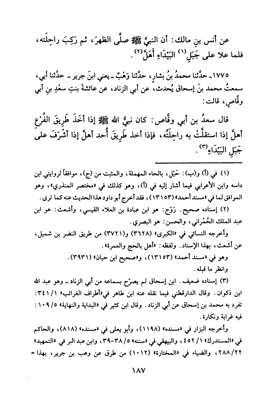 قال سعدُ بن أبي وقَّاص: كان نبيُّ الله - صلَّى الله عليه وسلم - إذا أخَذَ طَرِيقَ الفُرْعِ أهل إذا استقلَّتْ به راحِلَتُه، فإذا أخذ طَرِيقَ أُحد أهلَّ إذا أشْرَفَ على جَبَلِ البَيْدَاء (¬٣).