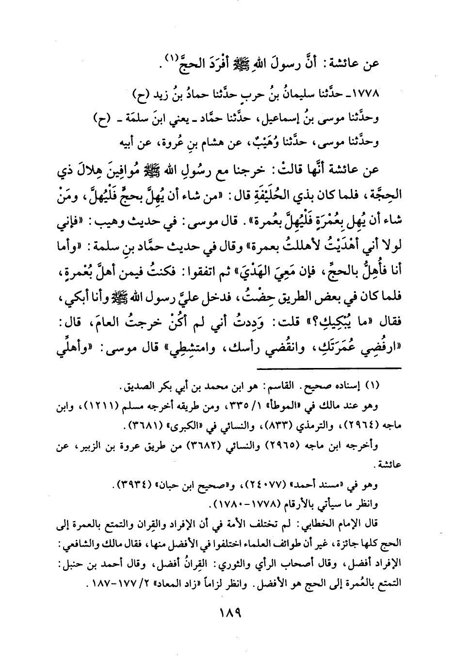 عن عائشة: أنَ رسولَ اللهِ - صلَّى الله عليه وسلم - أفْرَدَ الحجَّ (¬١).
