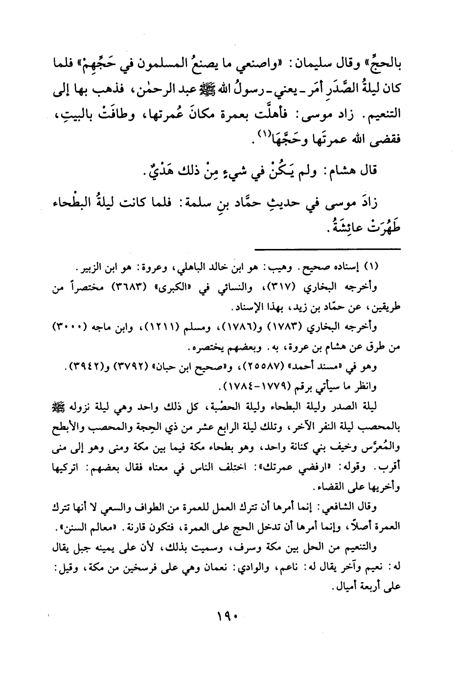 بالحجِّ" وقال سليمان: "واصنعي ما يصنعُ المسلمون في حَجهِمْ" فلما كان ليلةُ الصدَرِ أمَر - يعني - رسولُ الله - صلَّى الله عليه وسلم - عبد الرحمن، فذهب بها إلى التنعيم. زاد موسى: فأهلَّت بعمرة مكانَ عُمرتها، وطافَتْ بالبيتِ، فقضى الله عمرتَها وحَجَّهَا (¬١).
