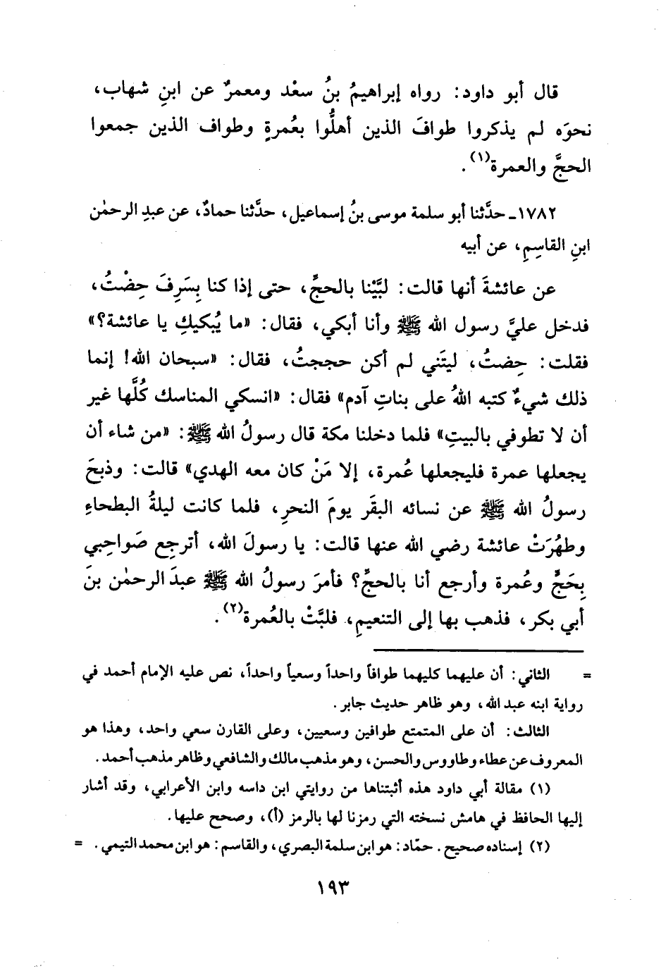 قال أبو داود: رواه إبراهيمُ بنُ سعْد ومعمر عن ابنِ شهاب، نحوَه لم يذكروا طوافَ الذين أهلُّوا بعُمرةٍ وطواف الذين جمعوا الحجَّ والعمرة (¬١).