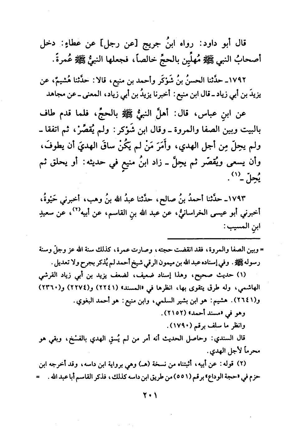 عن ابنِ عباس، قال: أهلَّ النبي - صلَّى الله عليه وسلم - بالحجِّ، فلما قدم طاف بالبيت وبين الصفا والمروة - وقال ابن شَوْكر: ولم يقصِّرْ، ثم اتفقا - ولم يحِلّ مِن أجل الهدي، وأَمَرَ مَنْ لم يكُنْ ساقَ الهديَ أن يطوفَ، وأن يسعى ويُقصّر ثم يحِلَّ - زاد ابنُ منيعٍ في حديثه: أو يحلق ثم يُحِل - (¬١).