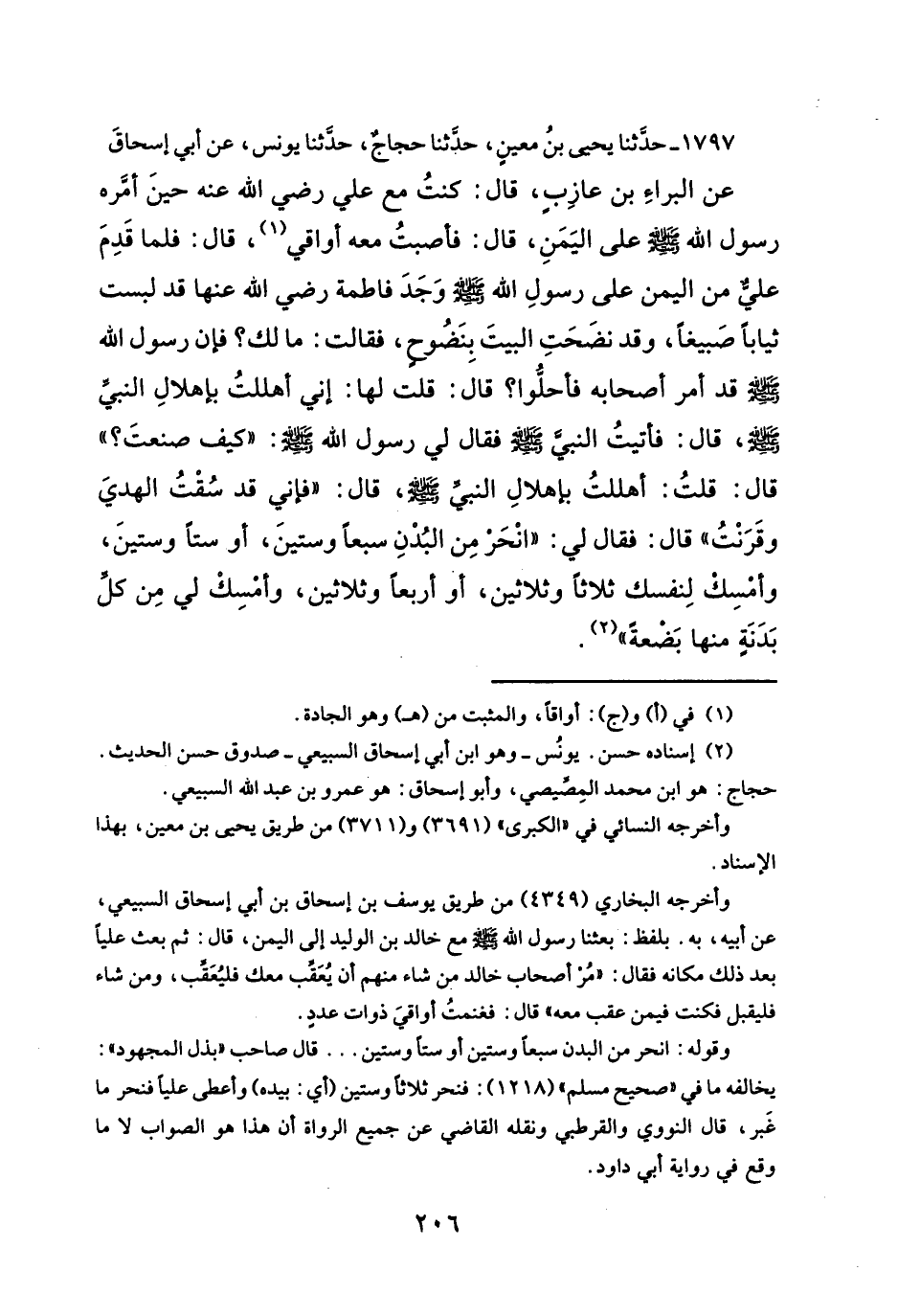 ١٧٩٧ - حدَّثنا يحيى بنُ معينٍ، حدَّثنا حجاجٌ، حدَّثنا يونس، عن أبي إسحاقَ عن البراء بن عازِبٍ، قال: كنتُ مع علي رضي الله عنه حينَ أمَّره رسول الله - صلَّى الله عليه وسلم - على اليَمَنِ، قال: فأصبتُ معه أواقي (¬١)، قال: فلما قَدِمَ عليٌّ من اليمن على رسولِ الله - صلَّى الله عليه وسلم - وَجَدَ فاطمة رضي الله عنها قد لبست ثياباً صَبيغاً، وقد نضَحَتِ البيتَ بِنَضُوحٍ، فقالت: ما لك؟ فإن رسول الله - صلَّى الله عليه وسلم - قد أمر أصحابه فأحلُّوا؟ قال: قلت لها: إني أهللتُ بإهلالِ النبيِّ - صلَّى الله عليه وسلم -، قال: فأتيتُ النبيَّ - صلَّى الله عليه وسلم - قال لي رسول الله: "كيف صنعتَ؟ " قال: قلتُ: أهللتُ بإهلالِ النبي - صلَّى الله عليه وسلم -، قال: "فإني قد سُقْتُ الهديَ وقَرَنْتُ" قال: فقال لي: "انْحَرْ مِن البُدْنِ سبعاً وستينَ، أو ستاً وستينَ، وأمسِك لِنفسك ثلاثاً وثلاثين، أو أربعاً وثلاثين، وأمسِكْ لي مِن كلِّ بَدَنَةٍ منها بَضْعةً" (¬٢).