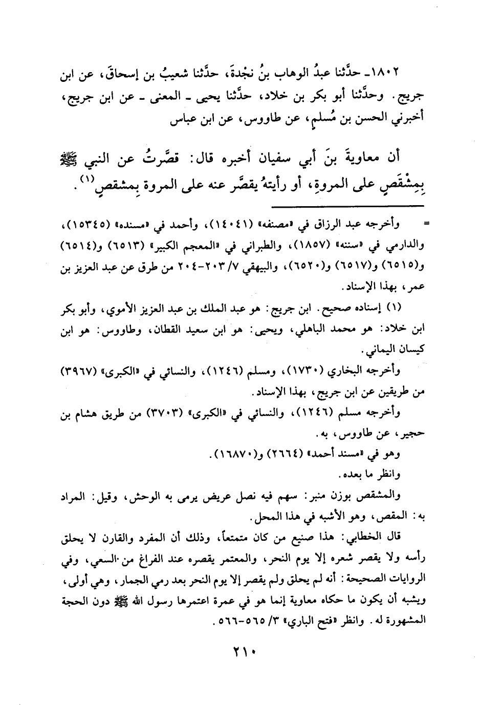 أن معاويةَ بنَ أبي سفيان أخبره قال: قصَّرتُ عن النبي - صلَّى الله عليه وسلم - بِمِشْقَصٍ على المروةِ، أو رأيتهُ يقصَّر عنه على المروة بِمشقصٍ (¬١).