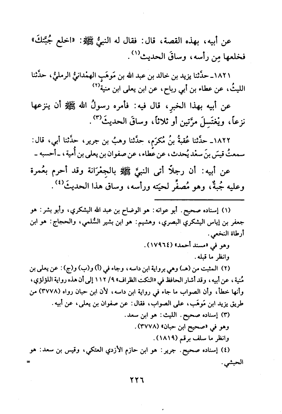 عن أبيه: أن رجلاً أتى النبيَّ - صلَّى الله عليه وسلم - بالجِعْرَانة وقد أحرم بعُمرة وعليه جُبةٌ، وهو مُصفِّر لحيَته ورأسه، وساق هذا الحديثَ (¬٤).