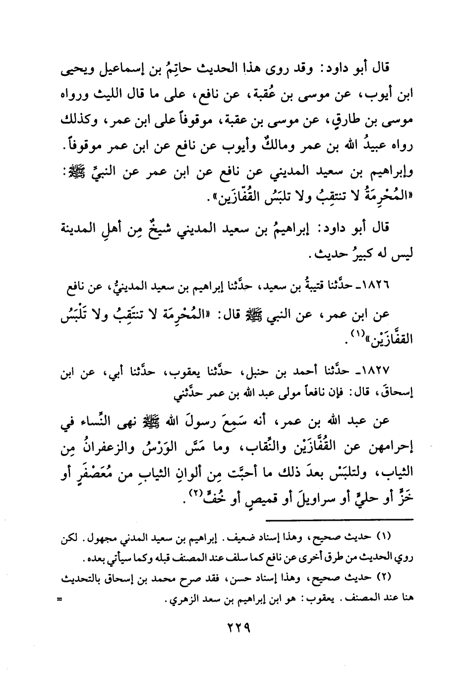 ١٨٢٦ - حدَّثنا قتيبةُ بن سعيد، حدَّثنا إبراهيم بن سعيد المدينيُّ، عن نافع عن ابن عمر، عن النبي - صلَّى الله عليه وسلم - قال: "المُحْرِمَة لا تنتَقِبُ ولا تَلْبَسُ القفازَيْن" (¬١).