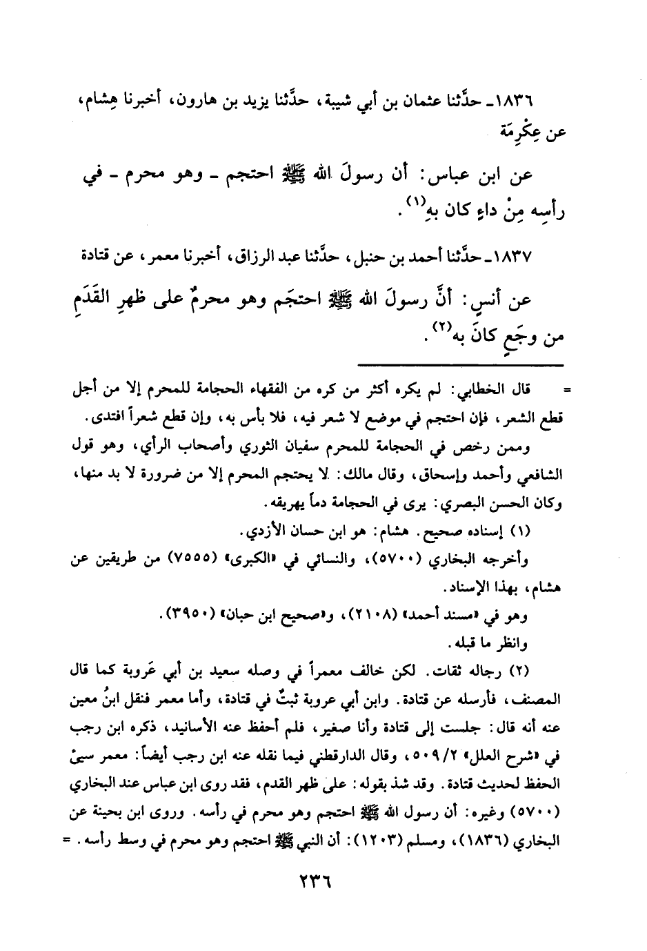 ١٨٣٧ - حدَّثنا أحمد بن حنبل، حدَّثنا عبد الرزاق، أخبرنا معمر، عن قتادة عن أنسِ: أنَّ رسولَ الله - صلَّى الله عليه وسلم - احتجَم وهو محرمٌ على ظهرِ القَدَمِ من وجَعٍ كانَ به (¬٢).