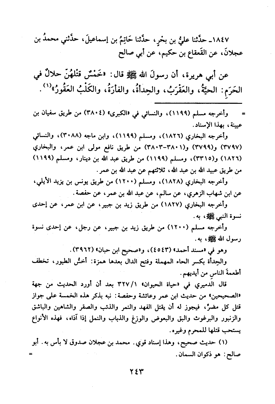 قال الدميري في "حياة الحيوان" ٣٢٧/ ١ بعد أن أورد الحديث من جهة "الصحيحين" من حديث ابن عمر وعائشة وحفصة: نبه بذكر هذه الخمسة على جواز قتل كل مضرٍّ، فيجوز له أن يقتل الفهد والنمر والذئب والصفر والشاهين والباشق والزنبور والبرغوث والبق والبعوض والوزغ والذباب والنمل إذا آذاه، فهذه الأنواع يستحب قتلها للمحرم وغيره.