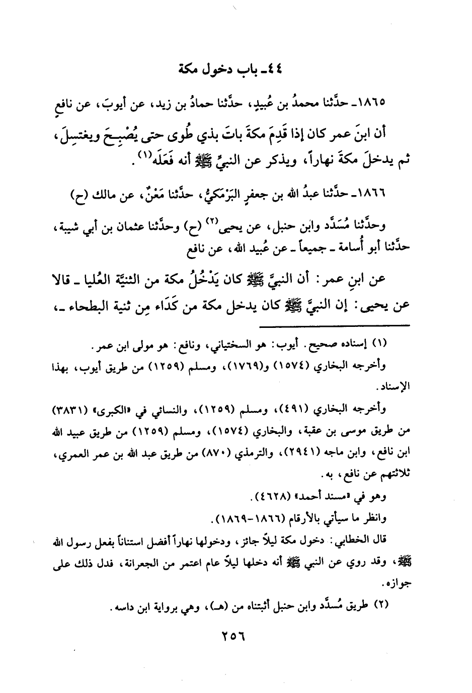 أن ابنَ عمر كان إذا قَدِمَ مكةَ باتَ بذي طُوى حتى يُصْبِحَ ويغتسِلَ، ثم يدخلَ مكةَ نهاراً، ويذكر عن النبيَّ - صلَّى الله عليه وسلم - أنه فَعَلَه (¬١).