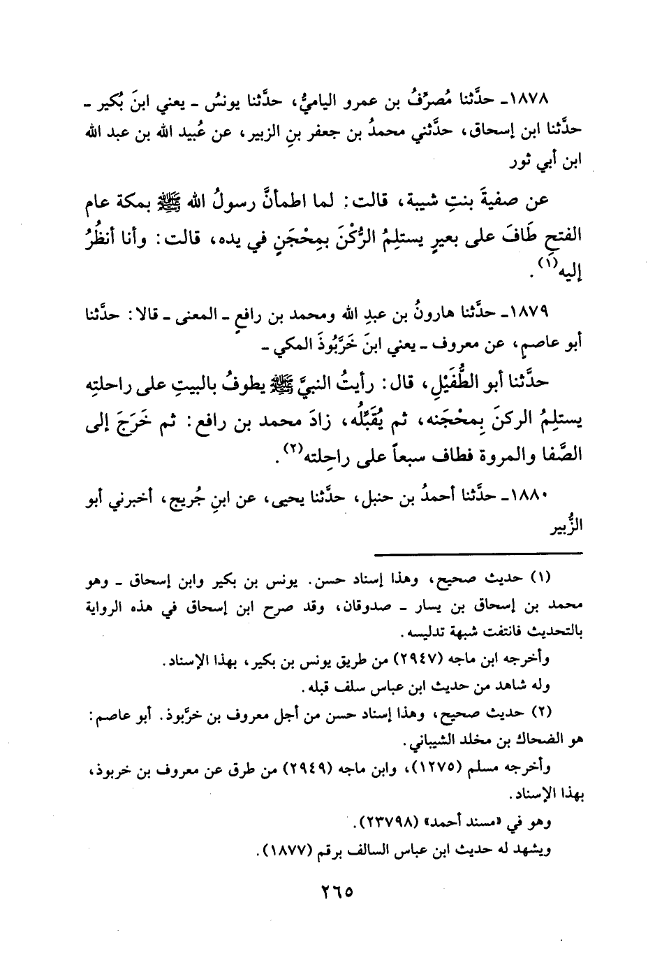 حدَّثنا أبو الطفَيْلِ، قال: رأيتُ النبي - صلَّى الله عليه وسلم - يطوفُ بالبيتِ على راحلتِه يستلِمُ الركنَ بِمحجَنه، ثم يُقبِّلُه، زادَ محمد بن رافع: ثم خَرَجَ إلى الصَّفا والمروة فطاف سبعاً على راحِلته (¬٢).
