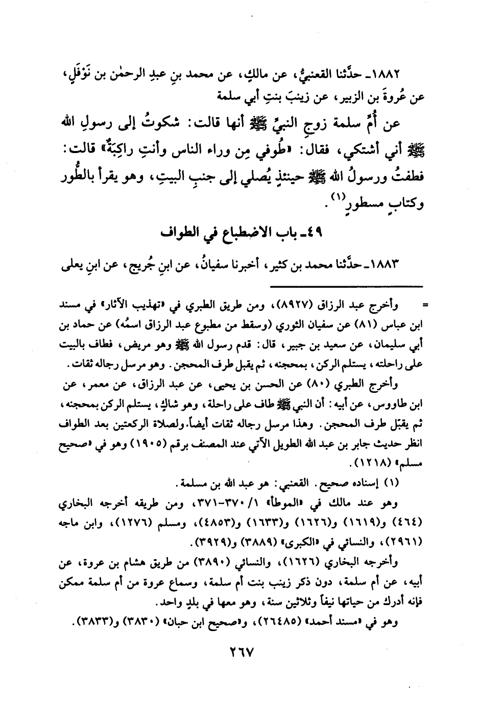 عن أُمِّ سلمة زوجِ النبي - صلَّى الله عليه وسلم - أنها قالت: شكوتُ إلى رسولِ الله - صلَّى الله عليه وسلم - أشتكي، فقال: "طُوفي مِن وراء الناس وأنتِ راكِبَةٌ" قالت: فطفتُ ورسولُ الله - صلَّى الله عليه وسلم - حينئذٍ يُصلي إلى جنبِ البيتِ، وهو يقرأ بالطُّور وكتابٍ مسطورٍ (¬١).