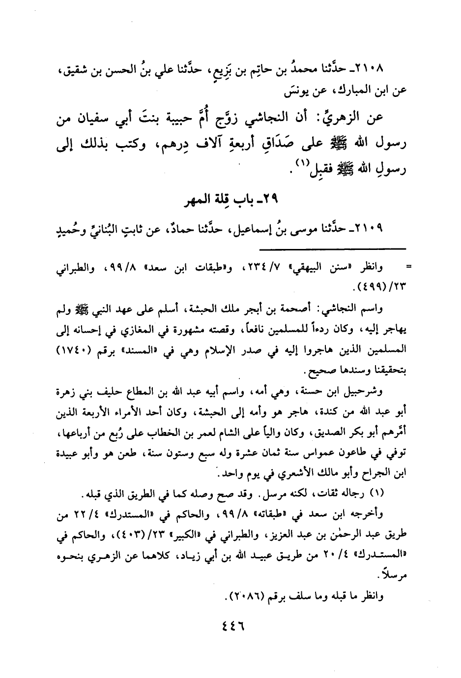عن الزهريِّ: أن النجاشي زوَّج أُمَّ حبيبة بنتَ أبي سفيان من رسول الله - صلَّى الله عليه وسلم - على صدَاقِ أربعةِ آلاف دِرهم، وكتب بذلك إلى رسولِ الله - صلَّى الله عليه وسلم - فقبِل (¬١).