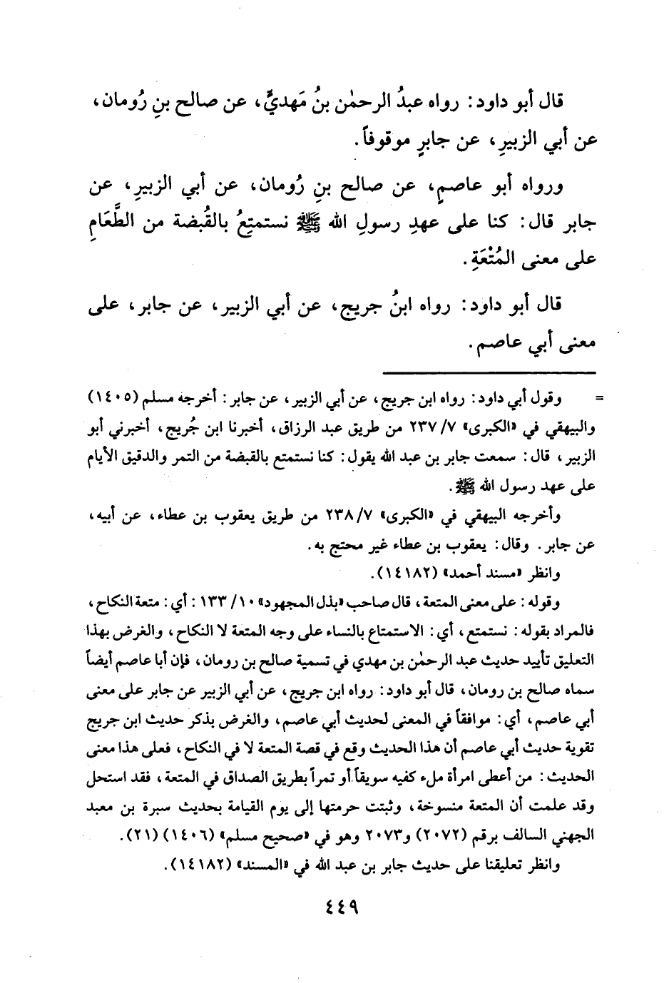 ورواه أبو عاصمٍ، عن صالح بنِ رُومان، عن أبي الزبيرِ، عن جابر قال: كنا على عهدِ رسولِ الله - صلَّى الله عليه وسلم - نستمتِعُ بالقُبضة من الطَّعَامِ على معنى المُتْعَةِ.
