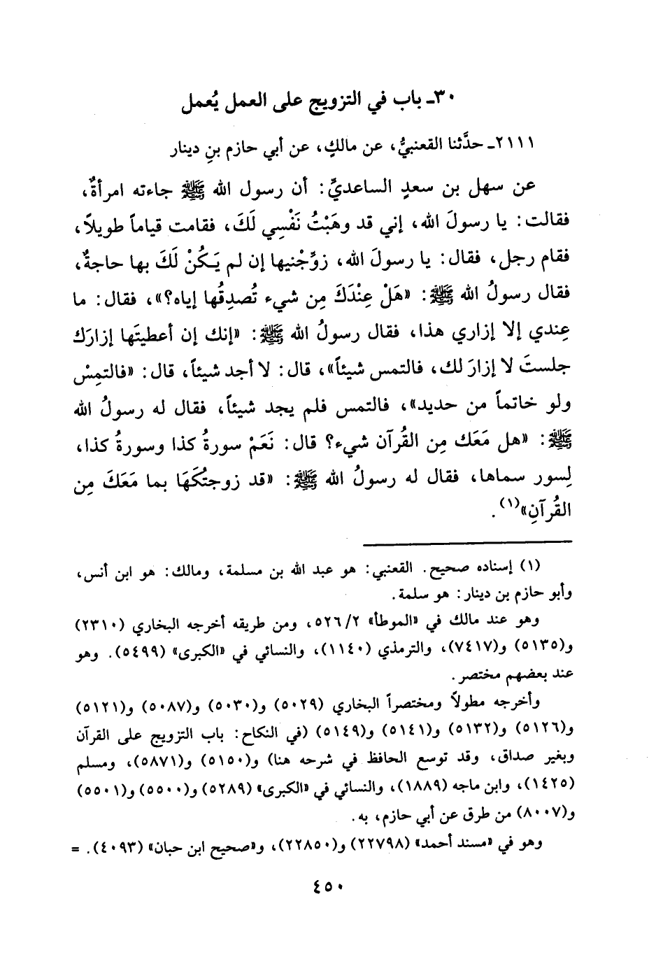 عن سهل بن سعدٍ الساعديِّ: أن رسول الله - صلَّى الله عليه وسلم - جاءته امرأةٌ، فقالت: يا رسولَ الله، إني قد وهَبْتُ نَفْسِي لَكَ، فقامت قياماً طويلاً، فقام رجل، فقال: يا رسولَ الله، زوِّجْنيها إن لم يَكُنْ لَكَ بها حاجةٌ، فقال رسولُ الله - صلَّى الله عليه وسلم -: "هلْ عِنْدَكَ مِن شيء تُصدِقُها إياه؟ "، فقال: ما عِندي إلا إزاري هذا، فقال رسولُ الله - صلَّى الله عليه وسلم -: "إنك إن أعطيتَها إزارَك جلستَ لا إزارَ لك، فالتمس شيئاً"، قال: لا أجد شيئاً، قال: "فالتمِسْ ولو خاتماً من حديد"، فالتمس فلم يجد شيئاً، فقال له رسولُ الله - صلَّى الله عليه وسلم -: "هل مَعَك مِن القُرآن شيء؟ قال: نَعَمْ سورةُ كذا وسورةُ كذا، لِسور سماها، فقال له رسولُ الله - صلَّى الله عليه وسلم -: "قد زوجتكهَا بما مَعَكَ مِن القُرآنِ" (¬١).