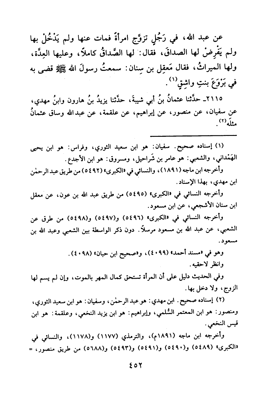 ٢١١٥ - حدَّثنا عثمانُ بنُ أبي شيبةَ، حدَّثنا يزيدُ بنُ هارون وابنُ مهدي، عن سفيان، عن منصور، عن إبراهيم، عن علقمة، عن عبد الله وساق عثمانُ مثلَه (¬٢).