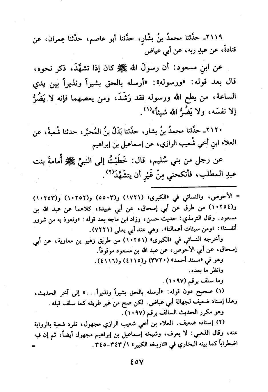 ٢١٢٠ - حدَّثنا محمدُ بنُ بشار، حدَّثنا بَدَلُ بنُ المُحبَّر، حدَّثنا شُعبةُ، عن العلاء ابنِ أخي شُعيب الرازي، عن إسماعيل بن إبراهيم