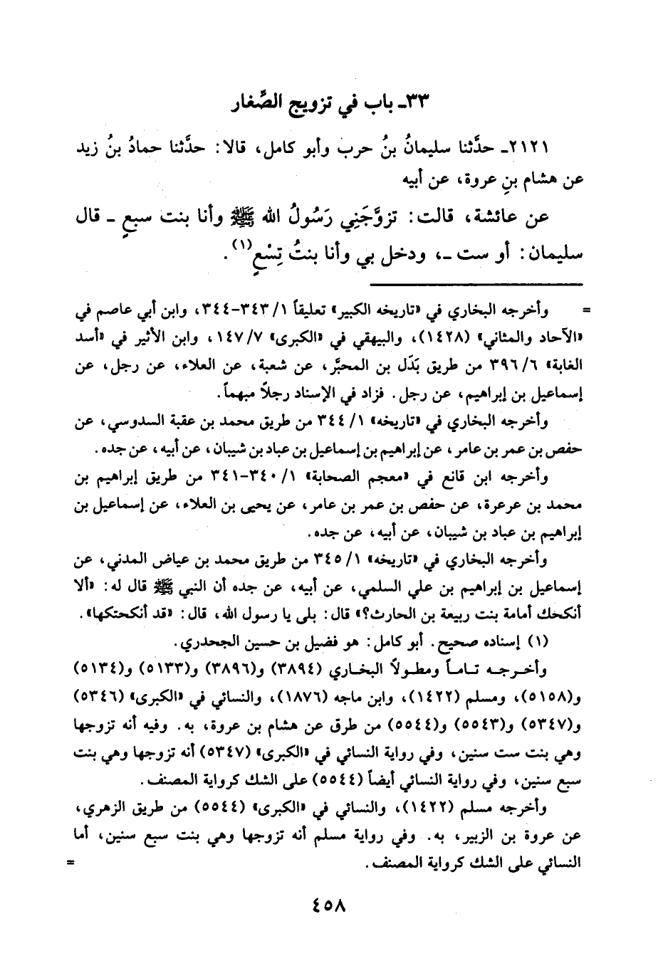 عن عائشة، قالت: تزوَّجَنِي رَسُولُ الله - صلَّى الله عليه وسلم - وأنا بنت سبعٍ - قال سليمان: أو ست -، ودخل بي وأنا بنتُ تِسعٍ (¬١).