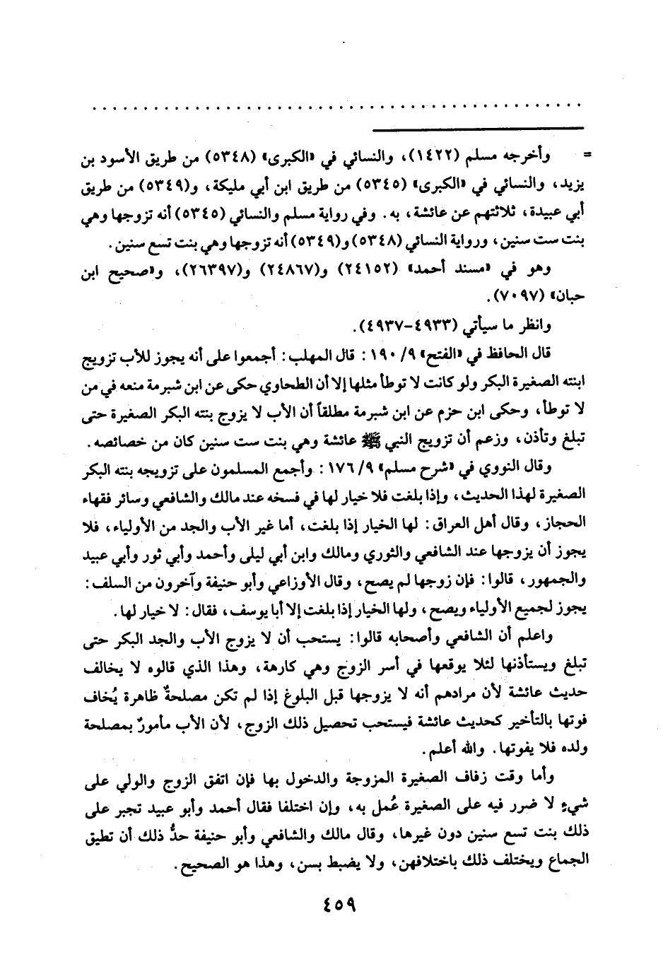واعلم أن الشافعي وأصحابه قالوا: يستحب أن لا يزوج الأب والجد البكر حتى تبلغ ويستأذنها لئلا يوقعها في أسر الزوج وهي كارهة، وهذا الذي قالوه لا يخالف حديث عائشة لأن مرادهم أنه لا يزوجها قبل البلوغ إذا لم تكن مصلحةٌ ظاهرة يُخاف فوتها بالتأخير كحديث عائشة فيستحب تحصيل ذلك الزوج، لأن الأب مأمورٌ بمصلحة ولده فلا يفوتها. والله أعلم.