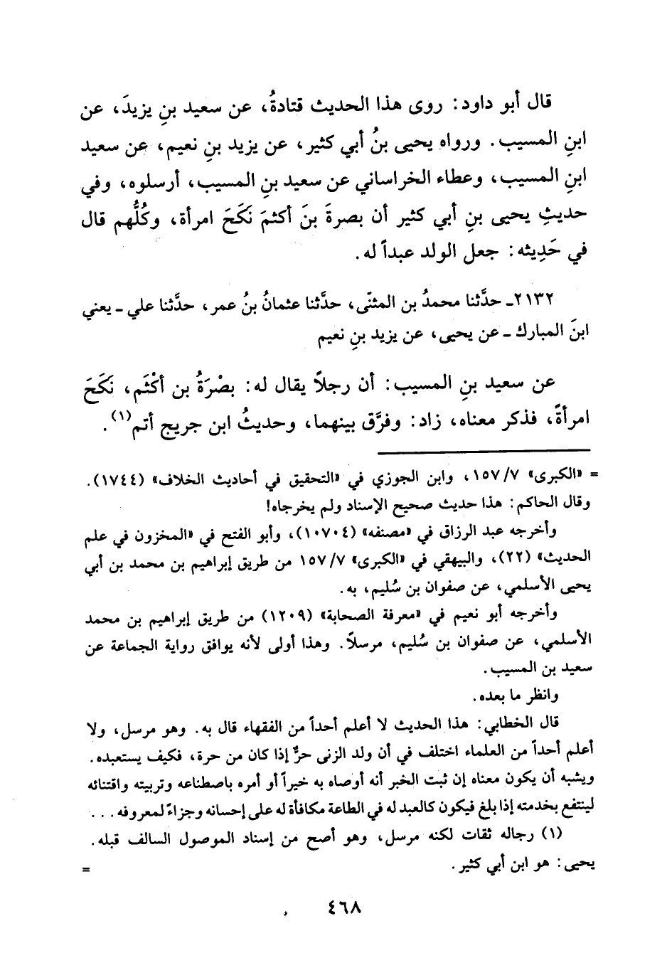 قال أبو داود: روى هذا الحديث قتادةُ، عن سعيد بنِ يزيدَ، عن ابنِ المسيب. ورواه يحيي بنُ أبي كثير، عن يزيد بنِ نعيم، عن سعيد ابنِ المسيب، وعطاء الخراساني عن سعيد بنِ المسيب، أرسلوه، وفي حديثِ يحيى بنِ أبي كثير أن بصرةَ بنَ أكثمَ نكَحَ امرأة، وكُلُّهم قال في حَدِيثه: جعل الولد عبداً له.