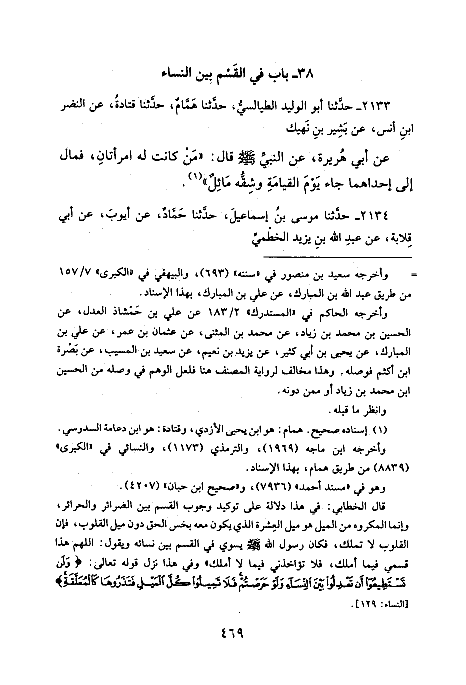 قال الخطابي: في هذا دلالة على توكيد وجوب القسم بين الضرائر والحرائر، وإنما المكروه من الميل هو ميل العِشرة الذي يكون معه بخس الحق دون ميل القلوب، فإن القلوب لا تملك، فكان رسول الله - صلَّى الله عليه وسلم - يسوي في القسم بين نسائه ويقول: اللهم هذا قسمي فيما أملك، فلا تؤاخذني فيما لا أملك" وفى هذا نزل قوله تعالى: {وَلَنْ تَسْتَطِيعُوا أَنْ تَعْدِلُوا بَيْنَ النِّسَاءِ وَلَوْ حَرَصْتُمْ فَلَا تَمِيلُوا كُلَّ الْمَيْلِ فَتَذَرُوهَا كَالْمُعَلَّقَةِ} [النساء: ١٢٩].