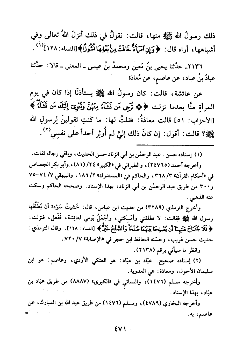 ٢١٣٦ - حدَّثنا يحيي بنُ مَعين ومحمدُ بنُ عيسى - المعنى - قالا: حدَّثنا عبادُ بنُ عباد، عن عاصمٍ، عن مُعاذة