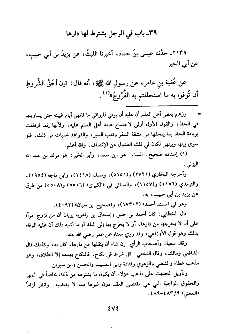 عن عُقبة بنِ عامر، عن رسولِ الله - صلَّى الله عليه وسلم -، أنه قال: "إن أحَقَّ الشُروطِ أن تُوفوا به ما استحللتم به الفُرُوجَ" (¬١).