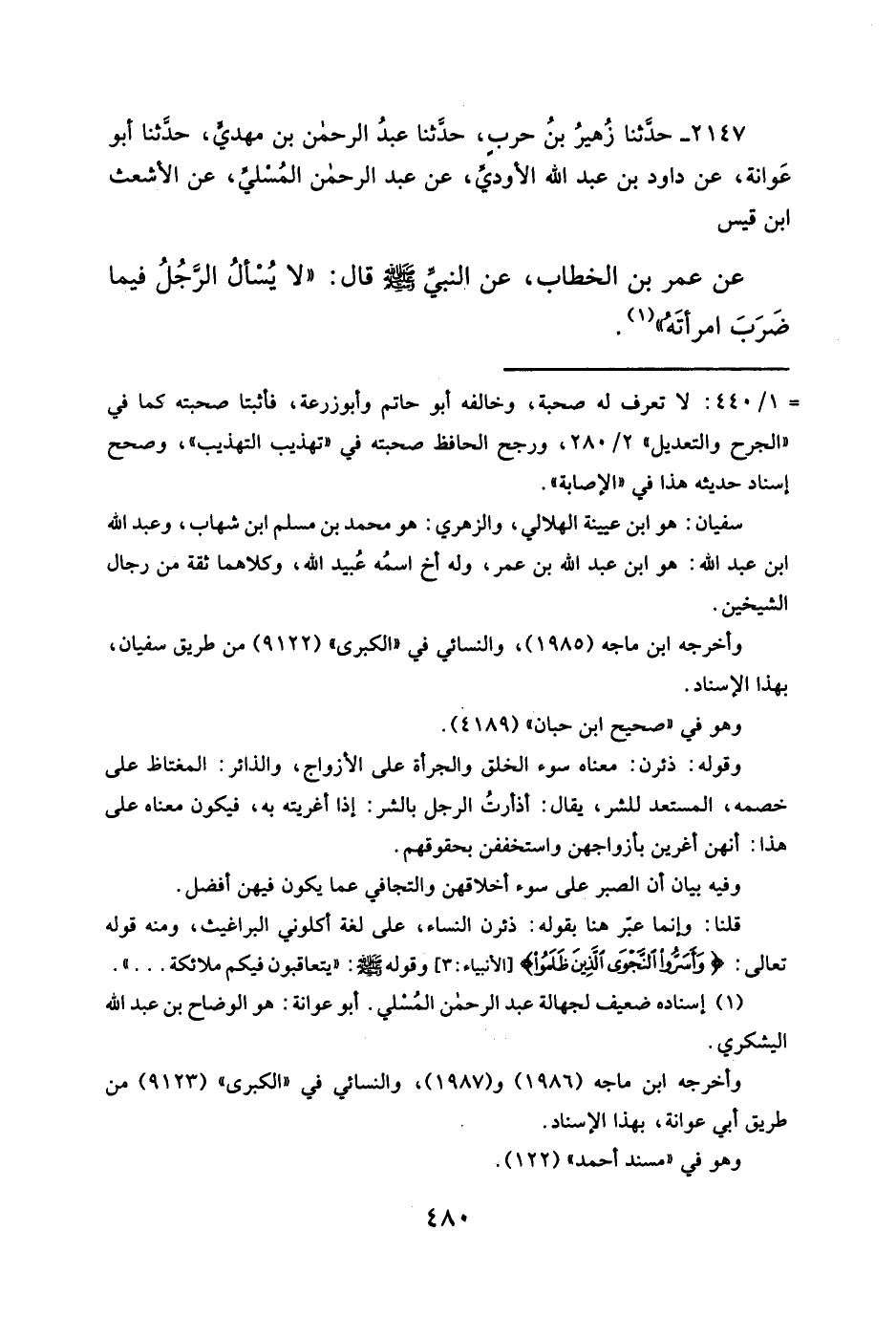 ٢١٤٧ - حدَّثنا زُهيرُ بنُ حربٍ، حدَّثنا عبدُ الرحمن بن مهديٍّ، حدَّثنا أبو عَوانة، عن داود بن عبد الله الأودي، عن عبد الرحمن المُسلىِّ، عن الأشعث ابن قيس