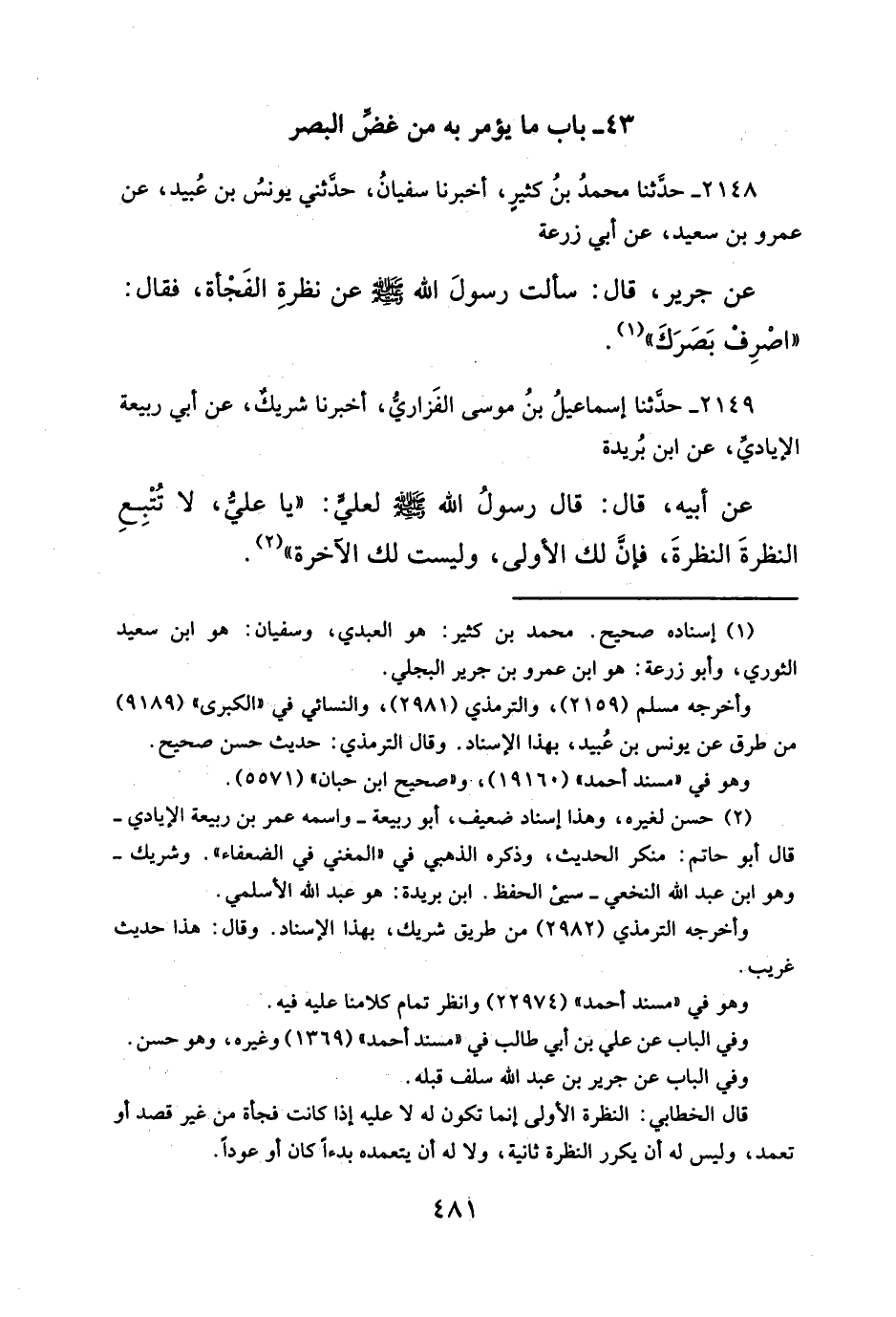 عن جرير، قال: سألت رسولَ الله - صلَّى الله عليه وسلم - عن نظرةِ الفَجْأة، فقال: "اصْرِف بَصَرَكَ" (¬١).