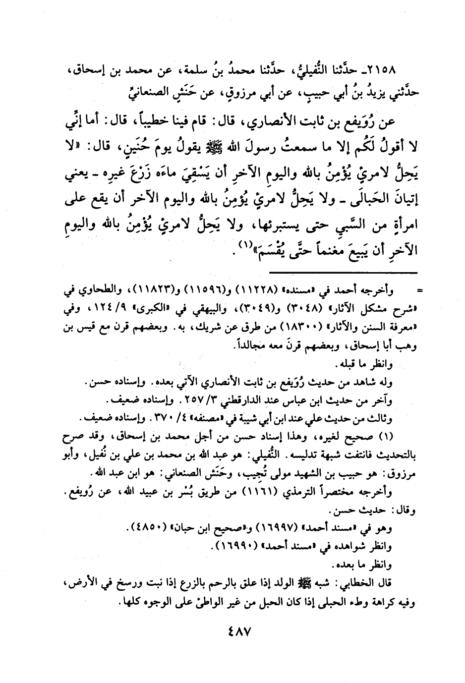 عن رُوَيفع بن ثابت الأنصاري، قال: قام فينا خطيباً، قال: أما إنِّي لا أقولُ لَكُم إلا ما سمعتُ رسولَ الله - صلَّى الله عليه وسلم - يقولُ يومَ حُنَينٍ، قال: "لا يَحِلُّ لامرئٍ يُؤمِنُ بالله واليومِ الآخرِ أن يَسْقِيَ ماءَه زَرع غيرِه - يعني إتيانَ الحَبالَى - ولا يَحِلُّ لامرئٍ يُؤمِنُ بالله واليوم الآخر أن يقع على امرأةٍ من السَّبيِ حتى يستبرئها، ولا يَحِل لامرئٍ يُؤْمِنُ بالله واليومِ الآخرِ أن يَبيعَ مغنماً حتى يُقسَمَ" (¬١).