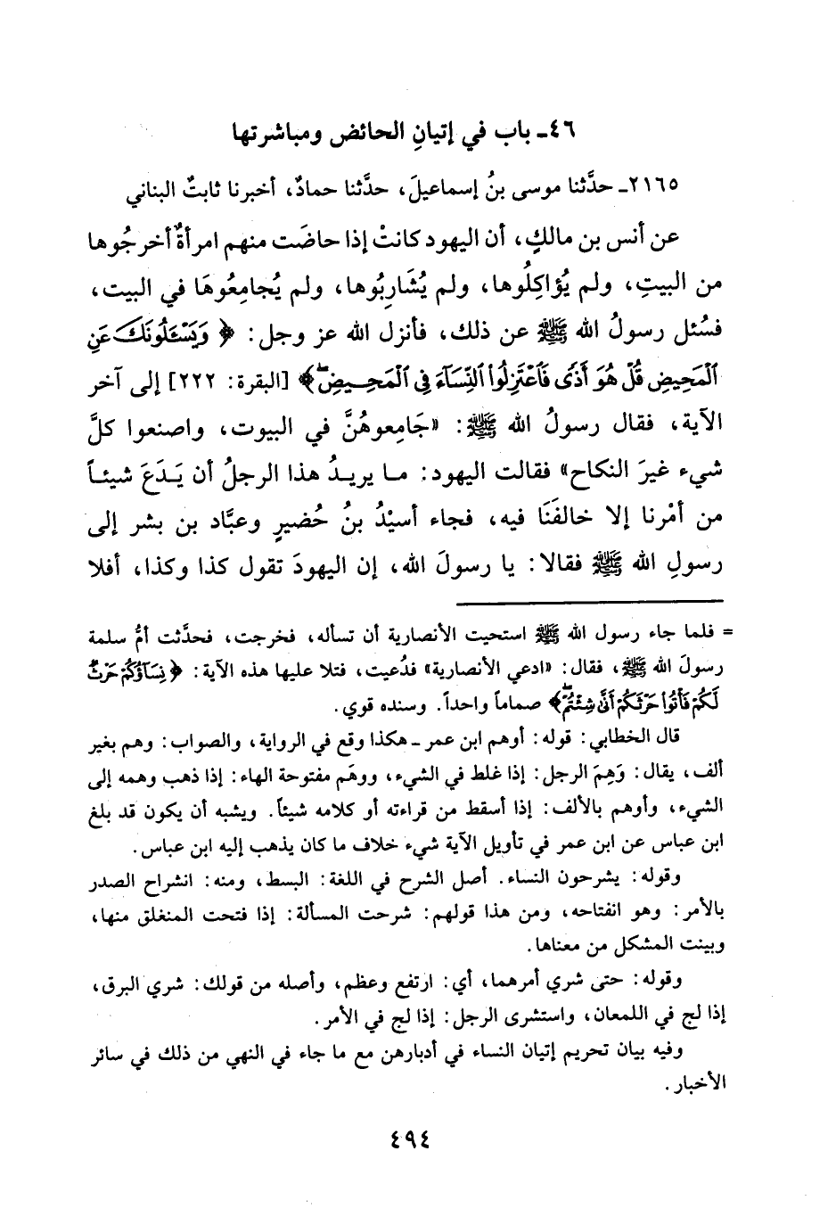 عن أنس بن مالكٍ، أن اليهود كانتْ إذا حاضَت منهم امرأةٌ أخرجُوها من البيتِ، ولم يُؤاكِلُوها، ولم يُشَارِبُوها، ولم يُجامِعُوهَا في البيت، فسُئل رسولُ الله - صلَّى الله عليه وسلم - عن ذلك، فأنزل الله عز وجل: {وَيَسْأَلُونَكَ عَنِ الْمَحِيضِ قُلْ هُوَ أَذًى فَاعْتَزِلُوا النِّسَاءَ فِي الْمَحِيضِ} [البقرة: ٢٢٢] إلى آخر الآية، فقال رسولُ الله - صلَّى الله عليه وسلم -: "جَامِعوهُنَّ في البيوت، واصنعوا كلَّ شيء غيرَ النكاح" فقالت اليهود: ما يريدُ هذا الرجلُ أن يَدَعَ شيئاً من أمْرنا إلا خالفَنَا فيه، فجاء أسيْدُ بنُ حُضيرٍ وعبَّاد بن بشر إلى رسولِ الله - صلَّى الله عليه وسلم - فقالا: يا رسولَ الله، إن اليهودَ تقول كذا وكذا، أفلا