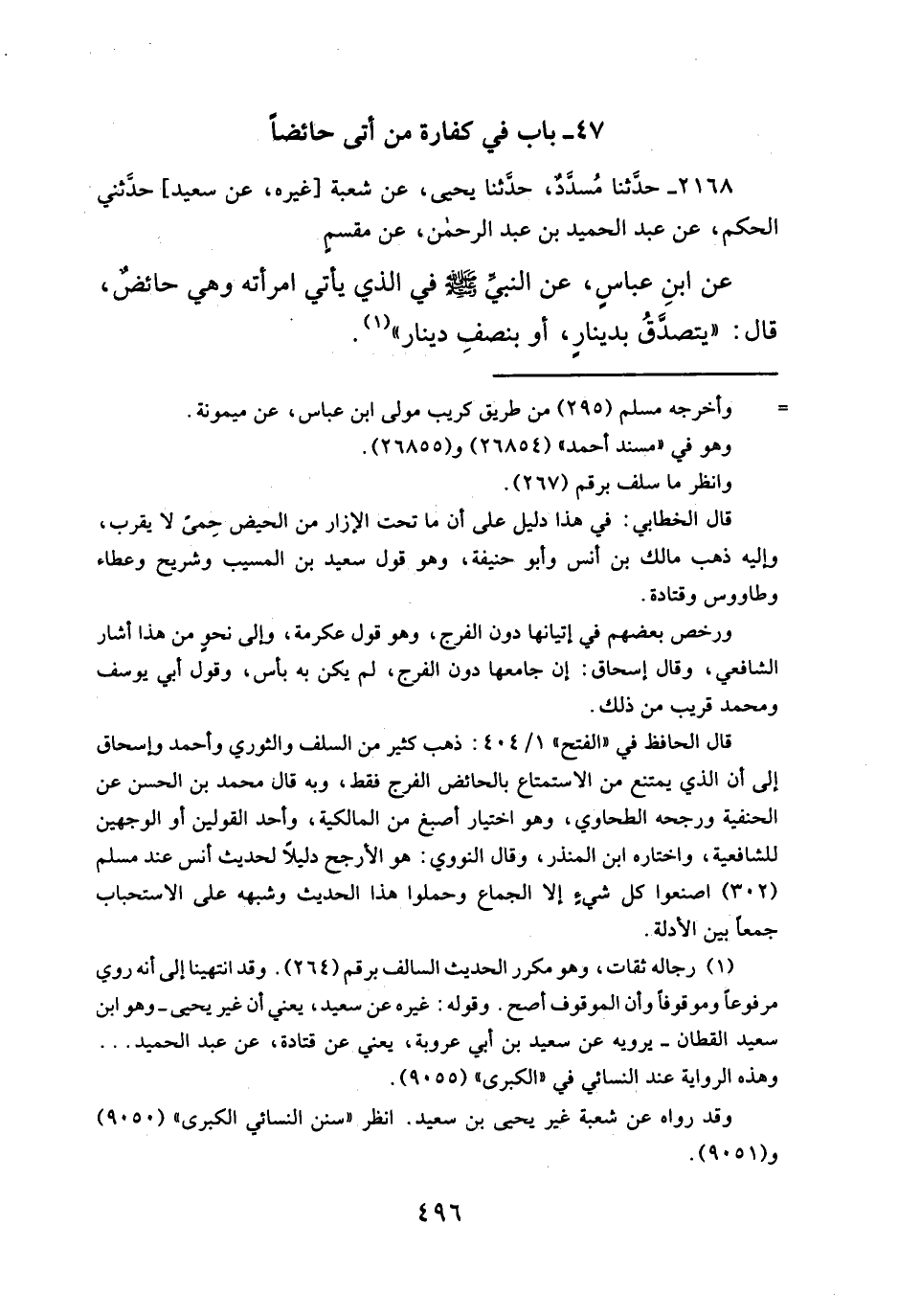 عن ابنِ عباسٍ، عن النبيِّ - صلَّى الله عليه وسلم - في الذي يأتي امرأته وهي حائضٌ، قال: "يتصدَّقُ بدينارٍ، أو بنصفِ دينار" (¬١).
