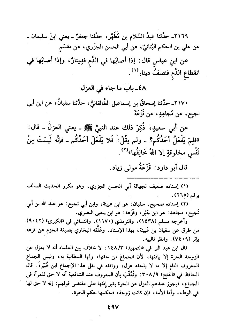 ٢١٦٩ - حدَّثنا عبدُ السَّلام بن مُطَهَّر، حدَّثنا جعفرٌ - يعني ابنَ سليمان - عن علي بن الحكم البُنانيِّ، عن أبي الحسن الجزَري، عن مقسَمٍ عن ابنِ عباسٍ قال: إذا أصابَها في الدَّمِ فدِينارٌ، وإذا أصابَها في انقطاعِ الدَّمِ فنصفُ دينار (¬١).