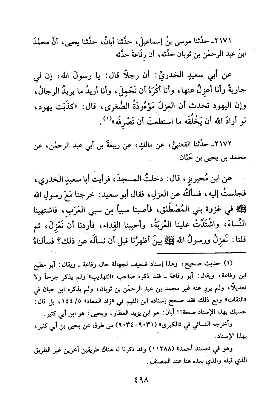 عن ابن مُحيريزٍ، قال: دخلتُ المسجدَ، فرأيت أبا سعيدٍ الخدري، فجلستُ إليه، فسألتُه عن العزلِ، فقال أبو سعيد: خرجنا مَعَ رسولِ الله - صلَّى الله عليه وسلم - في غزوة بني المُصطَلق، فأصبنا سبياً مِن سبي العَرَبِ، فاشتهينا النساء واشتَدَّتْ علينا العُزبةُ، وأحببنا الفِداء، فأردنا أن نَعْزِلَ، ثم قلنا: نَعزِلُ ورسولُ الله - صلَّى الله عليه وسلم - بينَ أظهرُنا قبل أن نسألَه عن ذلك؟ فسألناهُ