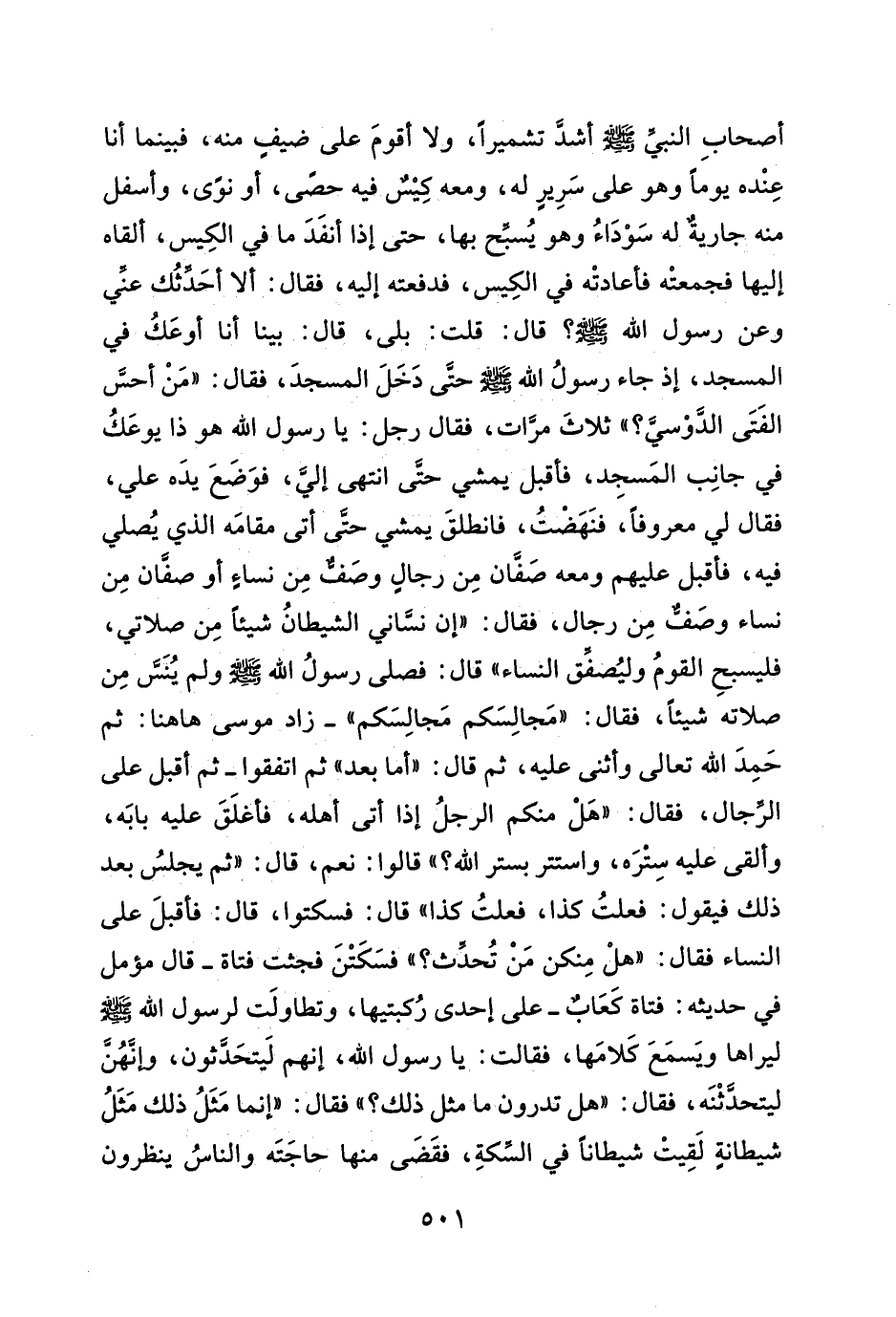 أصحابِ النبيَّ - صلَّى الله عليه وسلم - أشدَّ تشميراً، ولا أقومَ على ضيفٍ منه، فبينما أنا عِنْده يوماً وهو على سَرِيرٍ له، ومعه كِيْسٌ فيه حصى، أو نوى، وأسفل منه جاريةٌ له سَوْدَاءُ وهو يُسبِّح بها، حتى إذا أنفَدَ ما في الكِيس، ألقاه إليها فجمعتْه فأعادتْه في الكِيس، فدفعته إليه، فقال: ألا أحَدِّثُك عنِّي وعن رسول الله - صلَّى الله عليه وسلم -؟ قال: قلت: بلى، قال: بينا أنا أوعَكُ في المسجد، إذ جاء رسولُ الله - صلَّى الله عليه وسلم - حتَى دَخَلَ المسجدَ، فقال: "مَنْ أحسَّ الفَتَى الدَّوْسيَّ؟ " ثلاثَ مرَّات، فقال رجل: يا رسول الله هو ذا يوعَكُ في جانِب المَسجِد، فأقبل يمشي حتَّى انتهى إليَّ، فوَضَعَ يدَه علي، فقال لي معروفاً، فنَهَضْتُ، فانطلقَ يمشي حتَّى أتى مقامَه الذي يُصلي فيه، فأقبل عليهم ومعه صَفَّان مِن رجالٍ وصَفٌّ مِن نساءٍ أو صفَّان مِن نساء وصَفٌ مِن رجال، فقال: " إن نسَّاني الشيطانُ شيئاً مِن صلاتي، فليسبحِ القومُ وليُصفِّق النساء" قال: فصلى رسولُ الله - صلَّى الله عليه وسلم - ولم يُنَسَّ مِن صلاته شيئاً، فقال: "مَجالِسَكم مَجالِسَكم" - زاد موسى ها هنا: ثم حَمِدَ الله تعالى وأثنى عليه، ثم قال: "أما بعد" ثم اتفقوا - ثم أقبل على الرِّجال، فقال: "هَلْ منكم الرجلُ إذا أتى أهله، فأغلَقَ عليه بابَه، وألقى عليه سِتْرَه، واستتر بستر الله؟ " قالوا: نعم، قال: "ثم يجلسُ بعد ذلك فيقول: فعلتُ كذا، فعلتُ كذا" قال: فسكتوا، قال: فأقبلَ على النساء فقال: "هلْ مِنكن مَنْ تُحدِّث؟ " فسَكَتْنَ فجثت فتاة - قال مؤمل في حديثه: فتاة كَعَابٌ - على إحدى رُكبتيها، وتطاولَت لرسول الله - صلَّى الله عليه وسلم - ليراها ويَسمَعَ كَلامَها، فقالت: يا رسول الله، إنهم لَيتحَدَّثون، وإنهُنَّ ليتحدَّثْنَه، فقال: "هل تدرون ما مثل ذلك؟ " فقال: "إنما مَثَلُ ذلك مَثَلُ شيطانةٍ لَقِيتْ شيطاناً في السِّكةِ، فقَضَى منها حاجَتَه والناسُ ينظرون