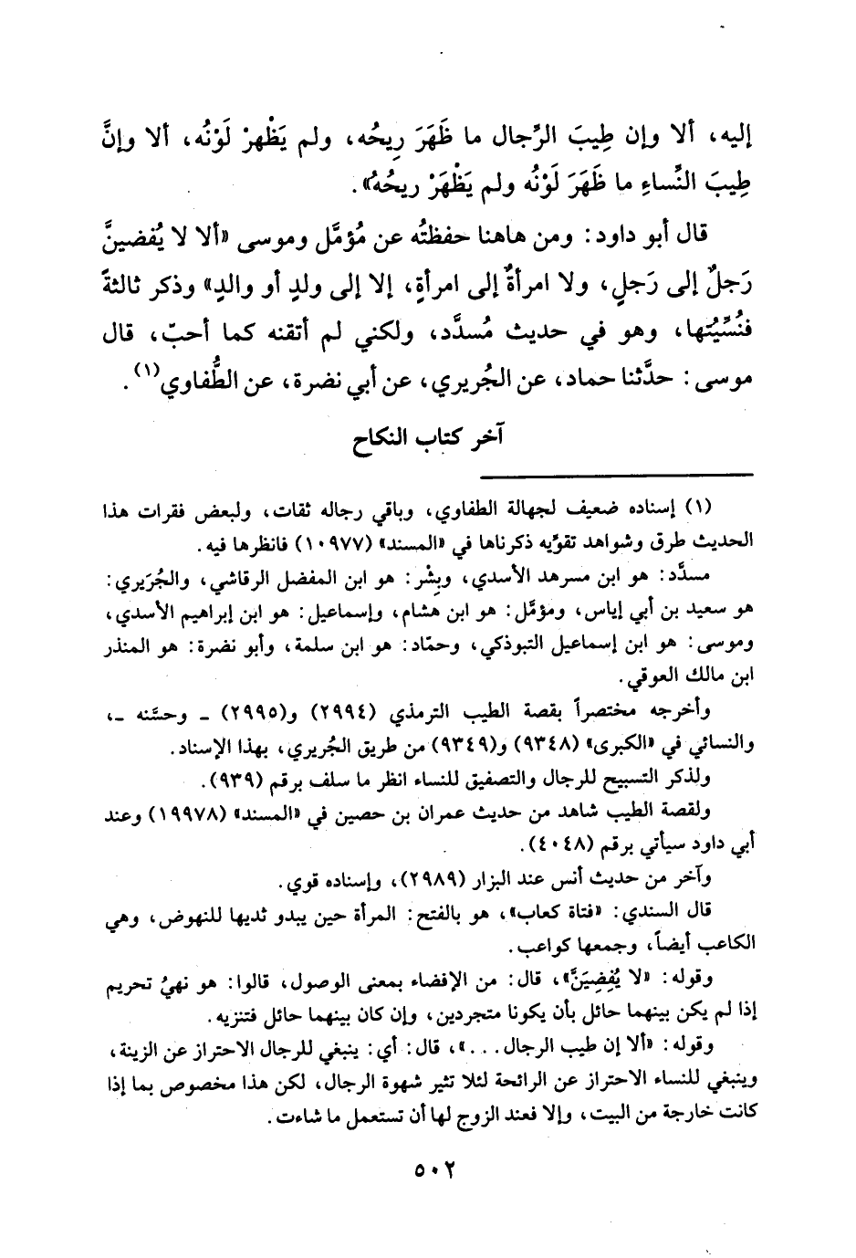 قال أبو داود: ومن ها هنا حفظتُه عن مُؤمَّل وموسى "ألا لا يُفضينَّ رَجلٌ إلى رَجلٍ، ولا امرأةٌ إلى امرأةٍ، إلا إلى ولدٍ أو والدٍ" وذكر ثالثةً فنُسِّيُتها، وهو في حديث مُسدَّدٌ، ولكني لم أتقنه كما أحبّ، قال موسى: حدَّثنا حماد، عن الجُريري، عن أبي نضرة، عن الطُّفاوي (¬١).