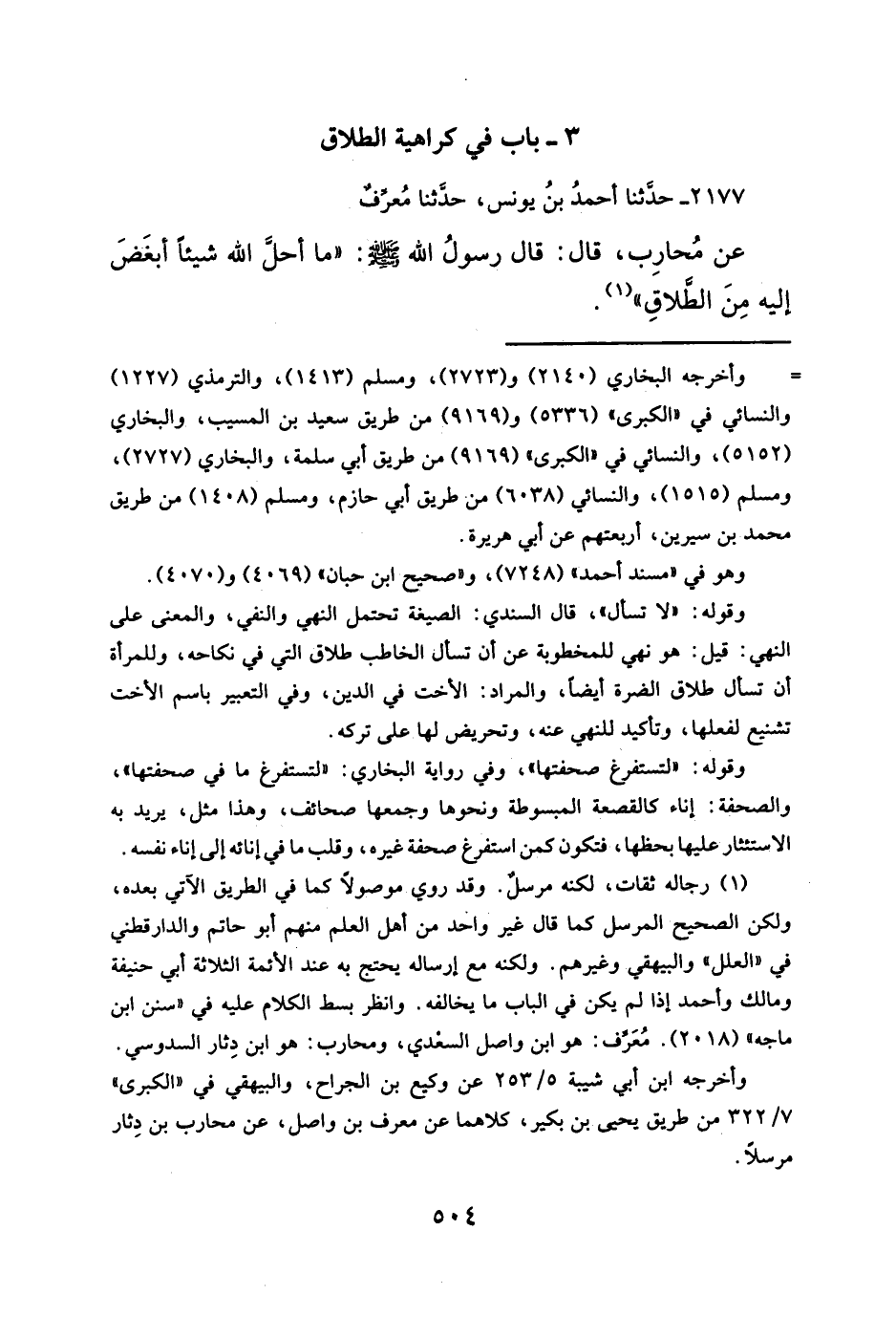عن مُحارِب، قال: قال رسولُ الله - صلَّى الله عليه وسلم -: "ما أحلَّ الله شيئاً أبغَضَ اليه مِنَ الطلاقِ" (¬١).