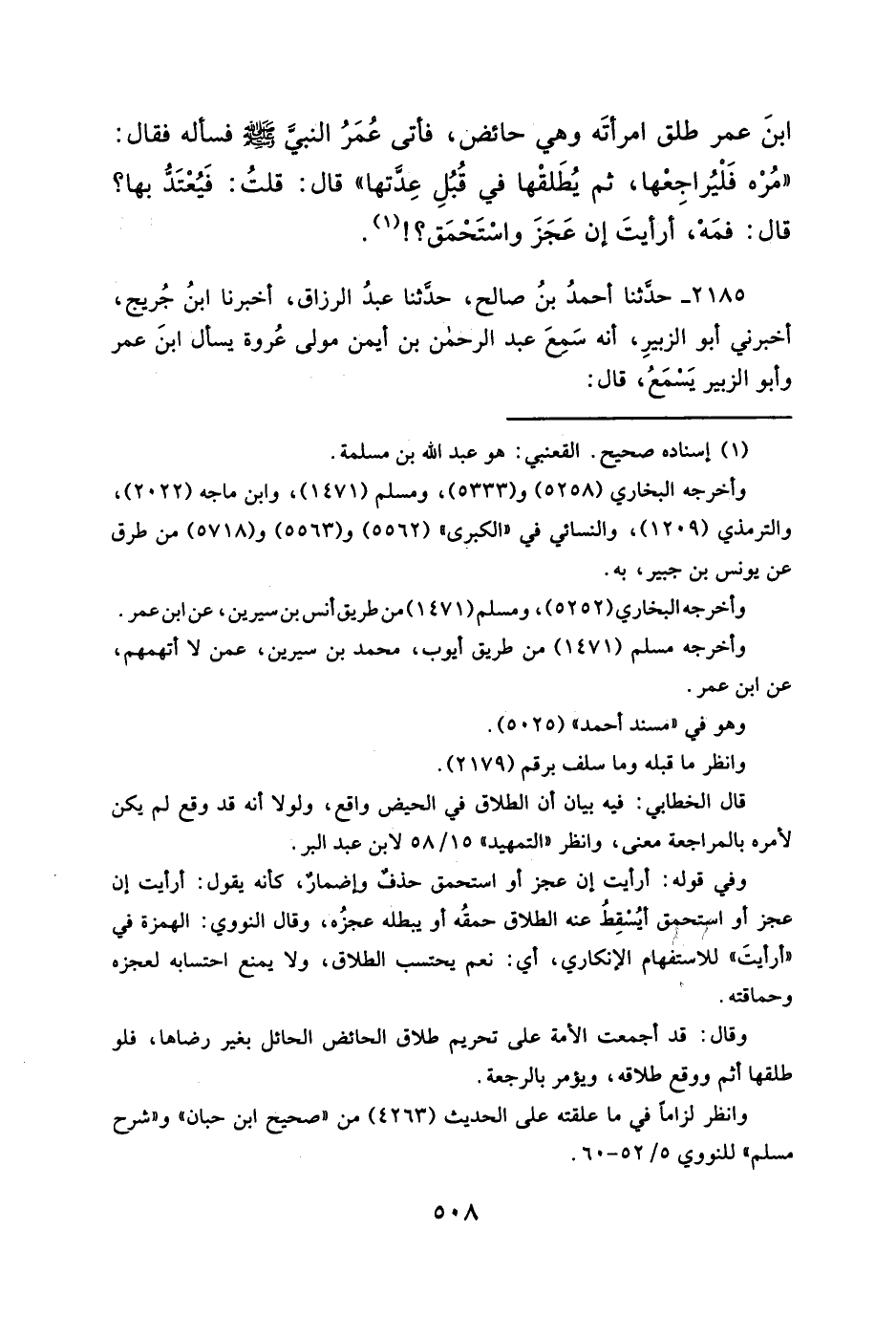 ٢١٨٥ - حدَّثنا أحمدُ بنُ صالح، حدّثنا عبدُ الرزاق، أخبرنا ابنُ جُريج، أخبرني أبو الزبيرِ، أنه سَمعَ عبد الرحمن بن أيمن مولى عُروة يسأل ابنَ عمر وأبو الزبير يَسمعُ، قال: