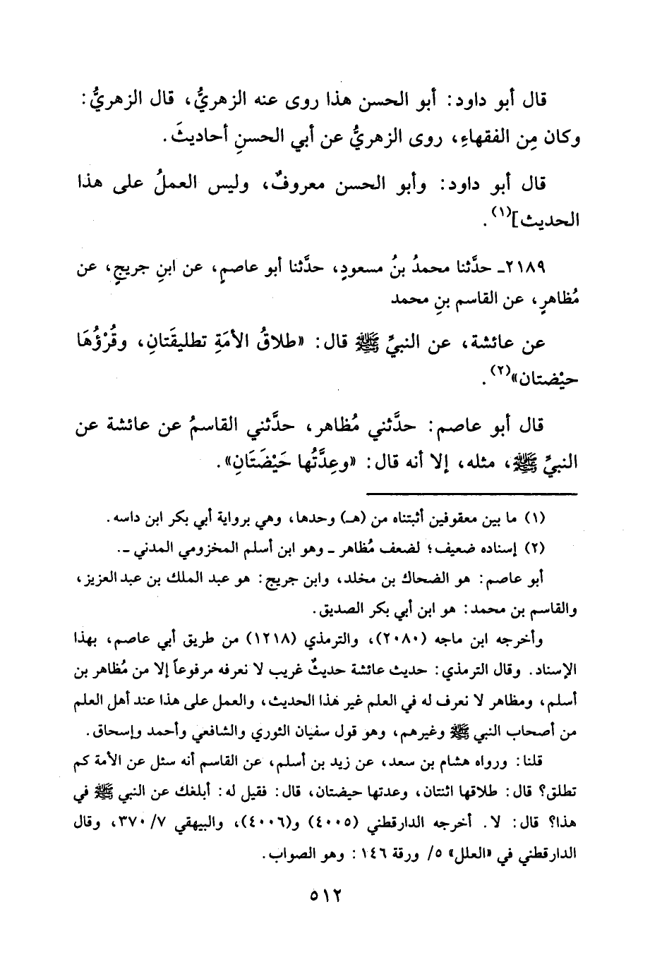 قال أبو عاصم: حدَّثني مُظاهر، حدثني القاسمُ عن عائشة عن النبيِّ - صلَّى الله عليه وسلم -، مثله، إلا أنه قال: "وعِدَتُها حَيْضَتَانِ".