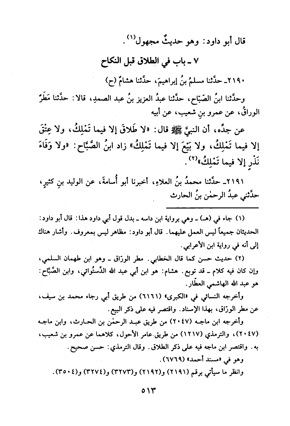 (¬١) جاء في (هـ) - وهي برواية ابن داسه - بدل قول أبي داود هذا: قال أبو داود: الحديثان جميعاً ليس العمل عليهما. قال أبو داود: مظاهر ليس بمعروف. وأشار هناك إلى أنه في رواية ابن الأعرابي.