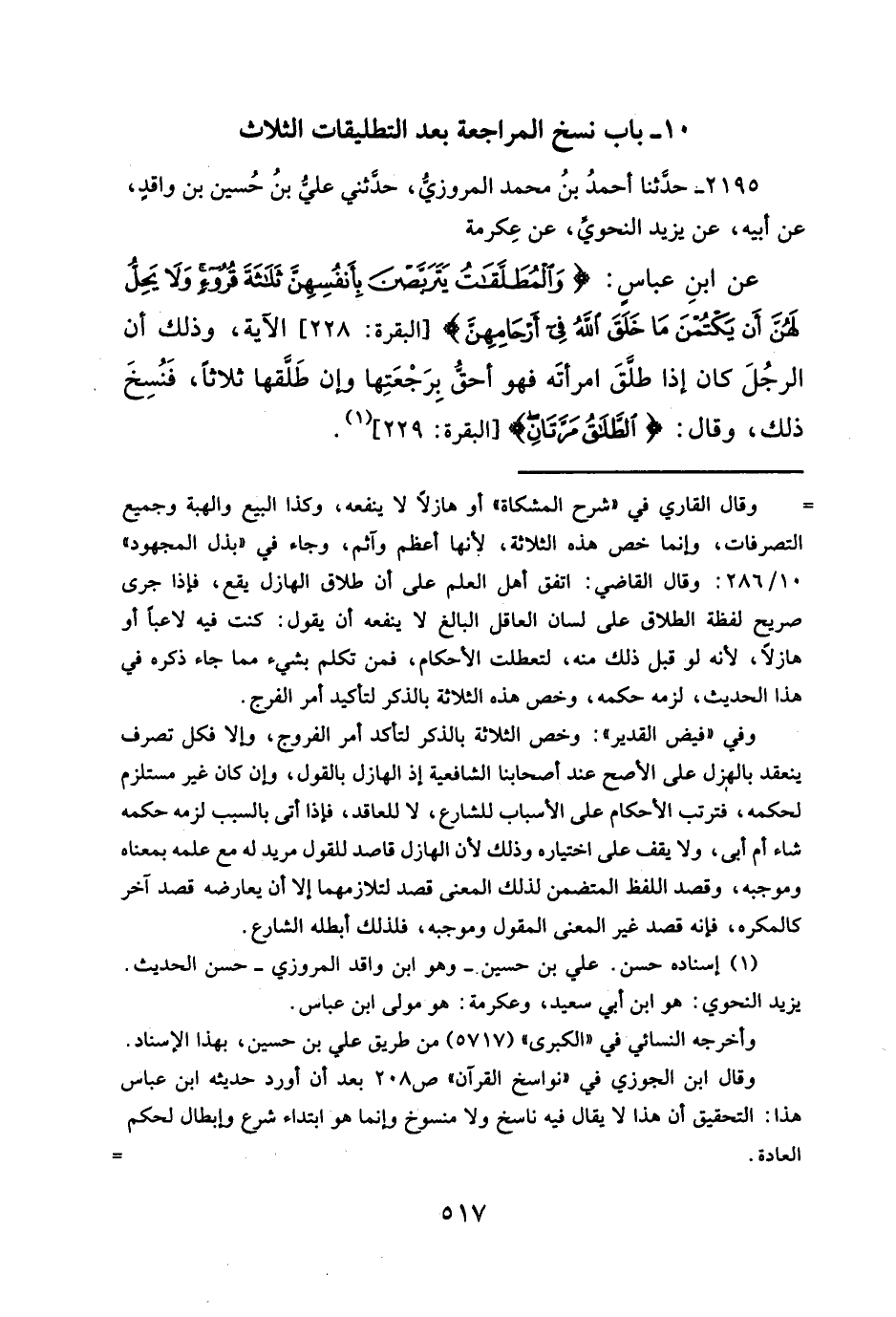 عن ابنِ عباسٍ: {وَالْمُطَلَّقَاتُ يَتَرَبَّصْنَ بِأَنْفُسِهِنَّ ثَلَاثَةَ قُرُوءٍ وَلَا يَحِلُّ لَهُنَّ أَنْ يَكْتُمْنَ مَا خَلَقَ اللَّهُ فِي أَرْحَامِهِنَّ} [البقرة: ٢٢٨] الآية, وذلك أن الرجُلَ كان إذا طلَّقَ امرأتَه فهو أحقُّ بِرَجْعَتِها وإن طَلَّقها ثلاثاً، فَنُسِخَ ذلك، وقال: {الطَّلَاقُ مَرَّتَانِ} [البقرة: ٢٢٩] (¬١).