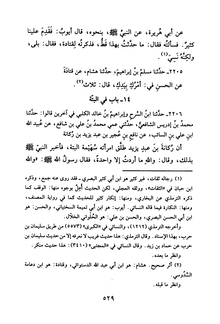 (¬١) رجاله ثقات، غير كثير هو ابن أبي كثير البصري - فقد روى عنه جمع، وذكره ابن حبان في "الثقات", ووثقه العجلي، لكن الحديث أُعِل بوجوه منها: الوقف كما ذكره الترمذي عن البخاري، ومنها: إنكار كثير للحديث كما في رواية المصنف، ومنها: النكارة فيما قاله النسائي. أيوب: هو ابن أبى تميمة السختياني، والحسن: هو ابن أبي الحسن البصري، والحسن بن علي: هو الحُلواني الخلاّل.