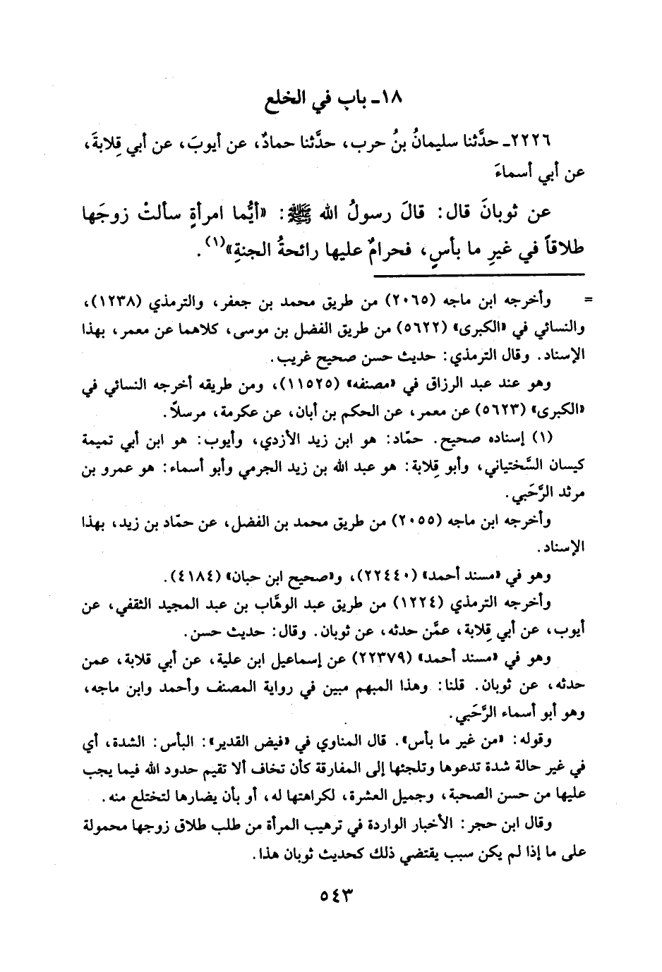وقال ابن حجر: الأخبار الواردة في ترهيب المرأة من طلب طلاق زوجها محمولة على ما إذا لم يكن سبب يقتضي ذلك كحديث ثوبان هذا.