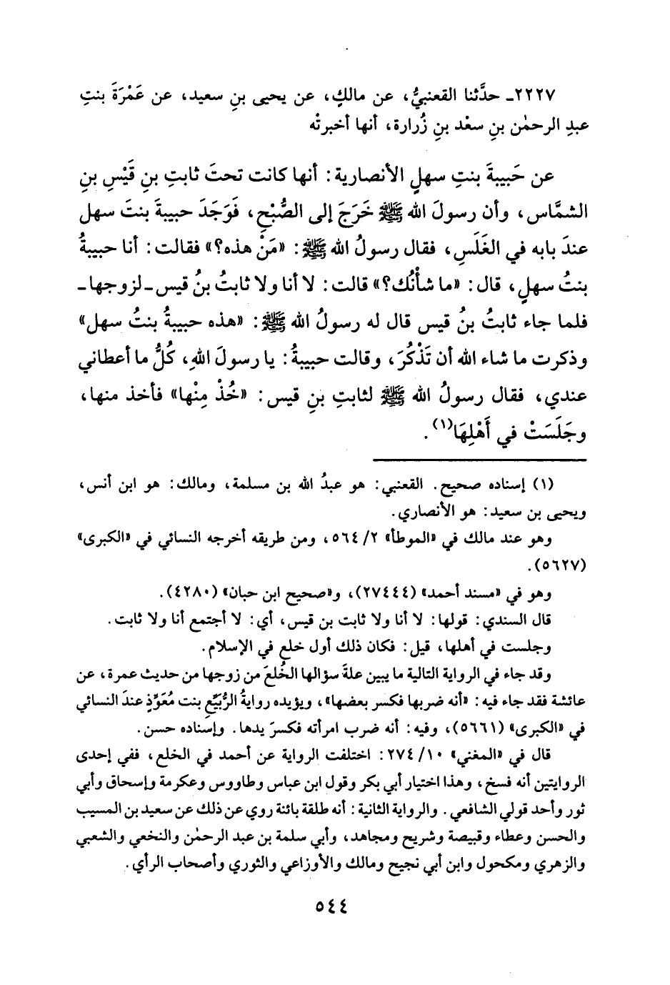 ٢٢٢٧ - حدَّثنا القعنبيُّ، عن مالك، عن يحيى بنِ سعيد، عن عَمرَةَ بنتِ عبدِ الرحمن بنِ سعد بنِ زُرارة، أنها أخبرتْه