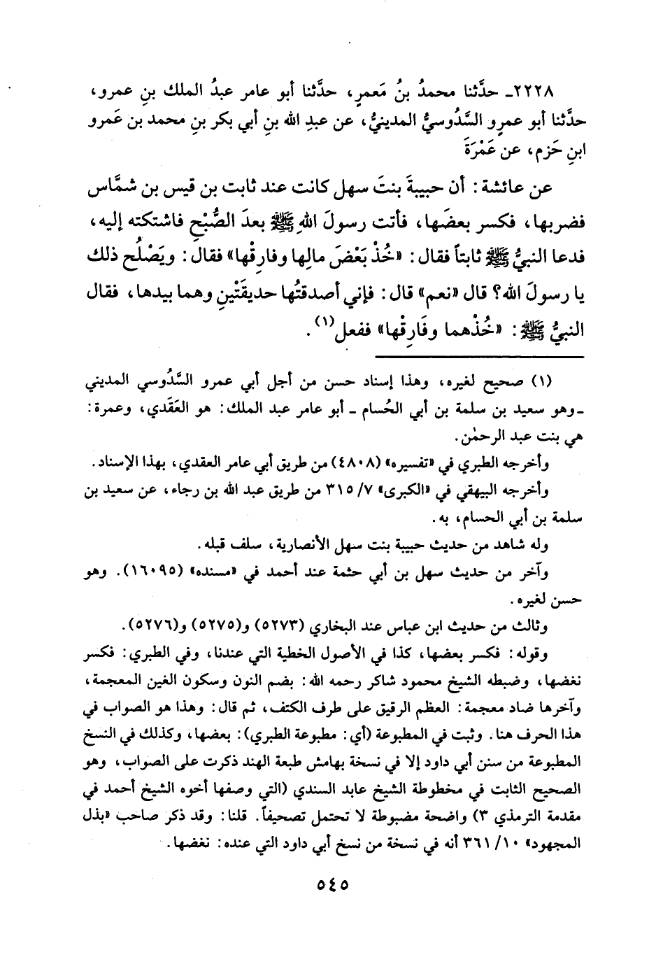 عن عائشة: أن حبيبةَ بنتَ سهل كانت عند ثابت بن قيس بن شمَّاس فضربها، فكسر بعضَها، فأتت رسولَ اللهِ - صلَّى الله عليه وسلم - بعدَ الصُّبْحِ فاشتكته إليه، فدعا النبي - صلَّى الله عليه وسلم - ثابتاً فقال: "خُذْ بَعْضَ مالِها وفارِقها" فقال: ويَصْلُح ذلك يا رسولَ الله؟ قال "نعم" قال: فإني أصدقتُها حديقَتْينِ وهما بيدها، فقال النبي - صلَّى الله عليه وسلم -: "خُذْهما وفَارِقْها" ففعل (¬١).