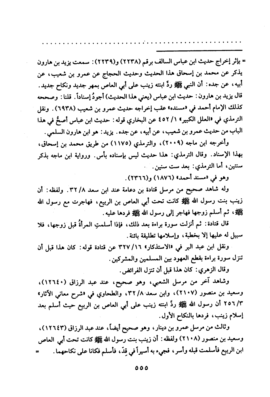 = بإثر إخراج حديث ابن عباس السالف برقم (٢٢٣٨) و (٢٢٣٩): سمعت يزيد بن هارون يذكر عن محمد بن إسحاق هذا الحديث وحديث الحجاج عن عمرو بن شعيب، عن أبيه، عن جده: أن النبي - صلَّى الله عليه وسلم - ردَّ ابنته زينب على أبي العاص بمهر جديد ونكاح جديد.
